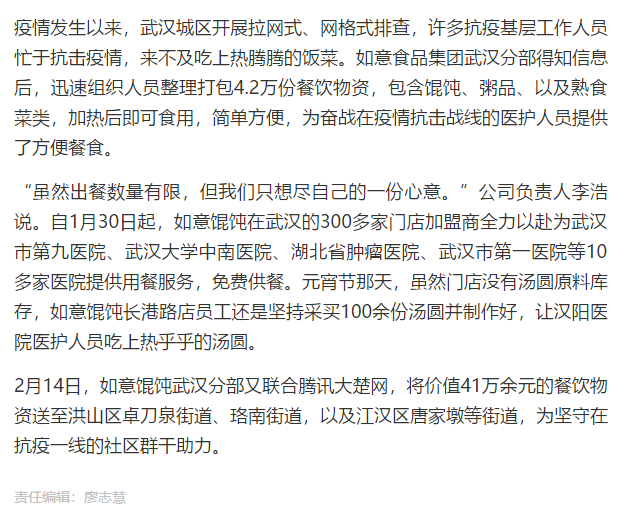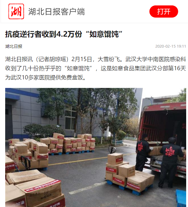 湖北日?qǐng)?bào)報(bào)道:抗疫逆行者收到4.2萬份“如意餛飩”