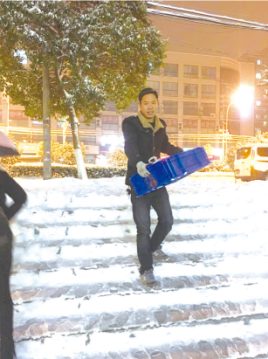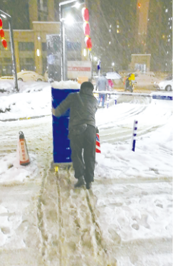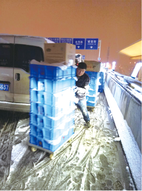 春運(yùn)臨近,鐵路沿線門(mén)店的配送難度異常巨大,配送車(chē)輛因?yàn)楸┭╁e(cuò)過(guò)安檢時(shí)間,最終配送人員利用兩天凌晨分4次配送,保證了門(mén)店的正常供貨。鎮(zhèn)江的配送員馬師傅在為地下門(mén)店配送時(shí),因?yàn)闃翘莘e雪過(guò)多太滑而摔倒受傷。